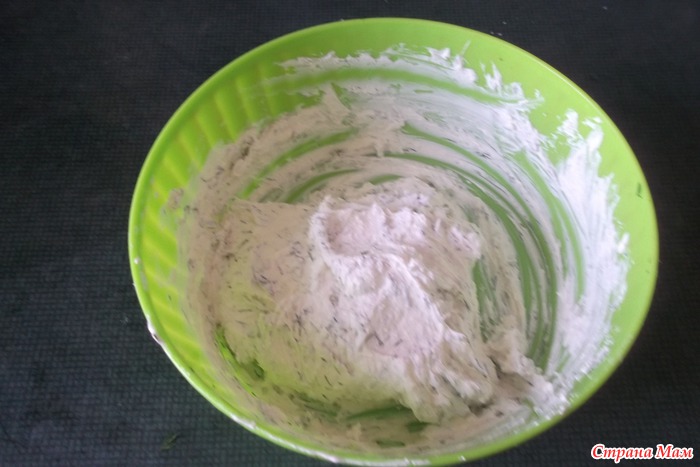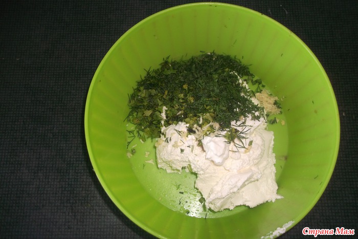 Хорошо вымешиваем творог с чесноком, солью и зеленью, если творог сухой, добавим больше сметаны